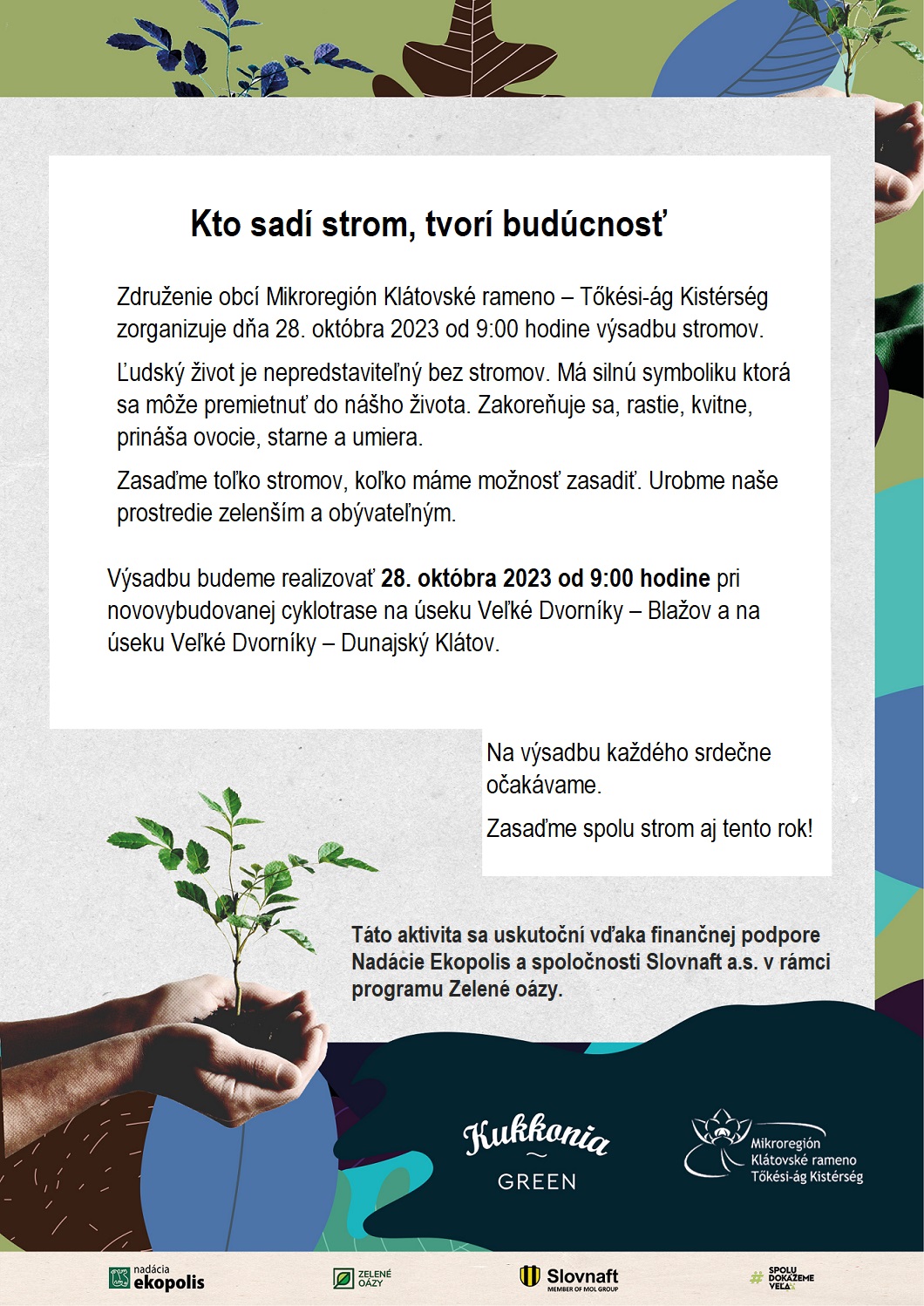 Výsadbu budeme realizovať 28. októbra 2023 od 9:00 hodine pri novovybudovanej cyklotrase na úseku Veľké Dvorníky – Blažov a na úseku Veľké Dvorníky – Dunajský Klátov. Na výsadbu každého srdečne očakávame.